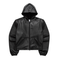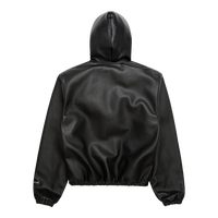 100% genuine leather jacket with hood and defined shoulder shape. Hand cut and hand stitched in the USA with cotton fleece lining and black matte finished zipper.
