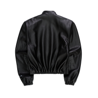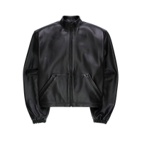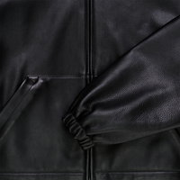 100% genuine leather jacket with stand collar and defined shoulder shape. Hand cut and hand stitched in the USA with cotton fleece lining and black matte finished zipper.