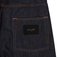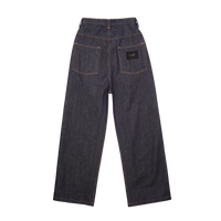 Pleated straight-leg denim in either raw, crisp denim or a light blanket wash. Made in the USA with relaxed fit and adjustable drawstring waist.